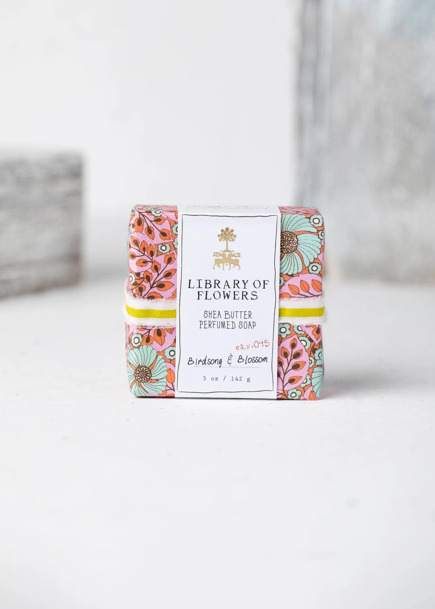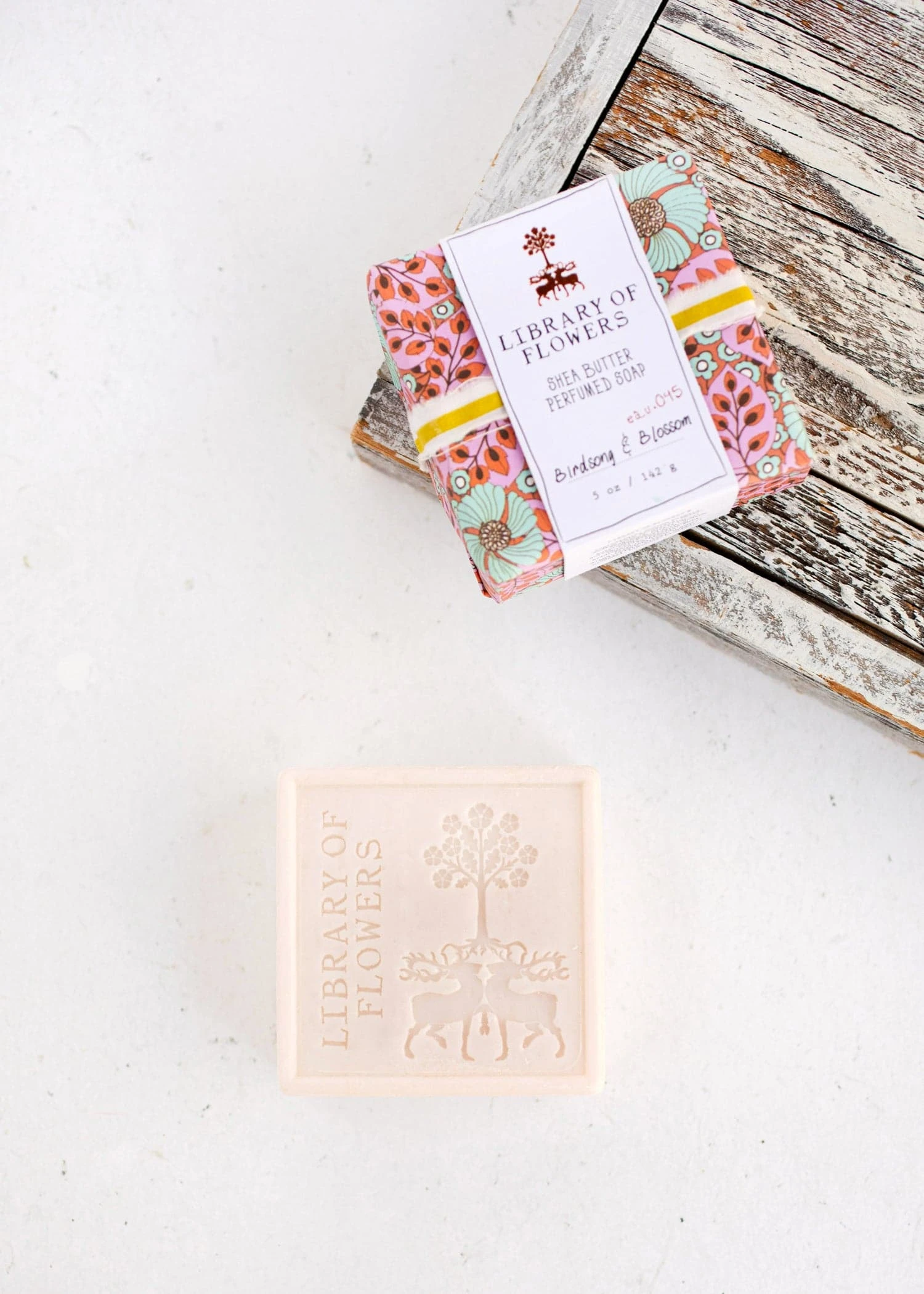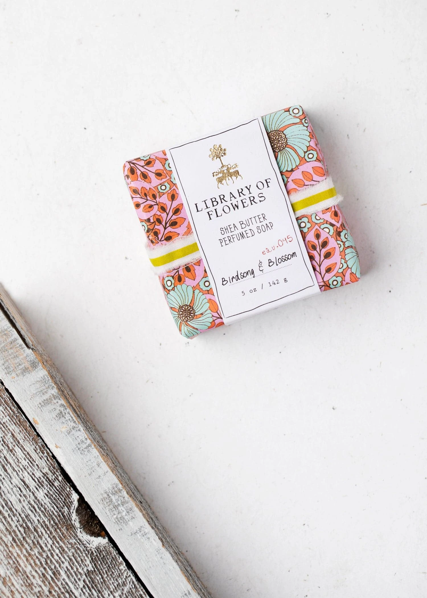 Each soap is debossed with the signature Library of Flowers crest, then artfully wrapped in one of 10 vibrant and playful botanical patterns. A citron-striped ribbon ties it all together, while a touch of copper foil adds an eye-catching shine.