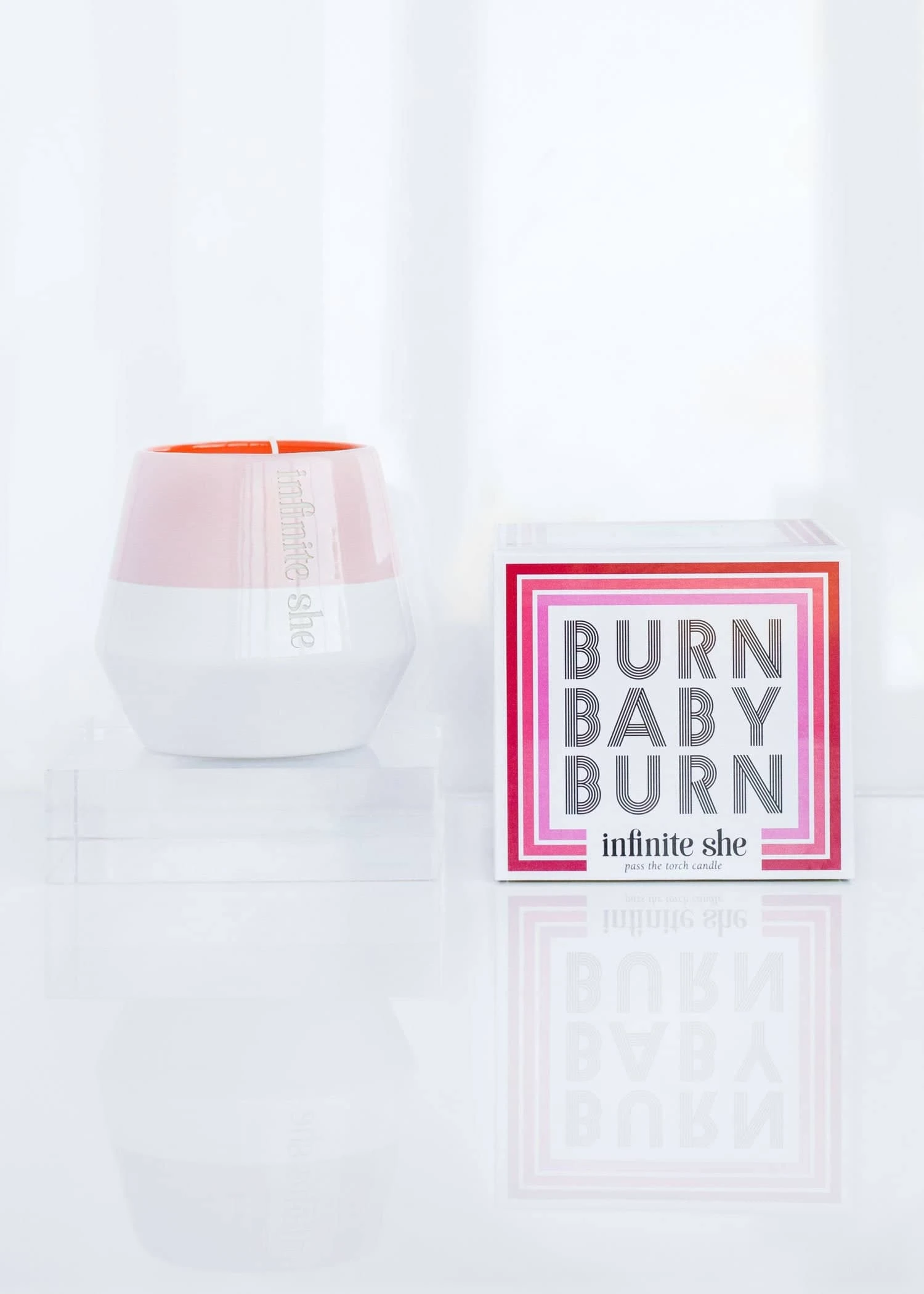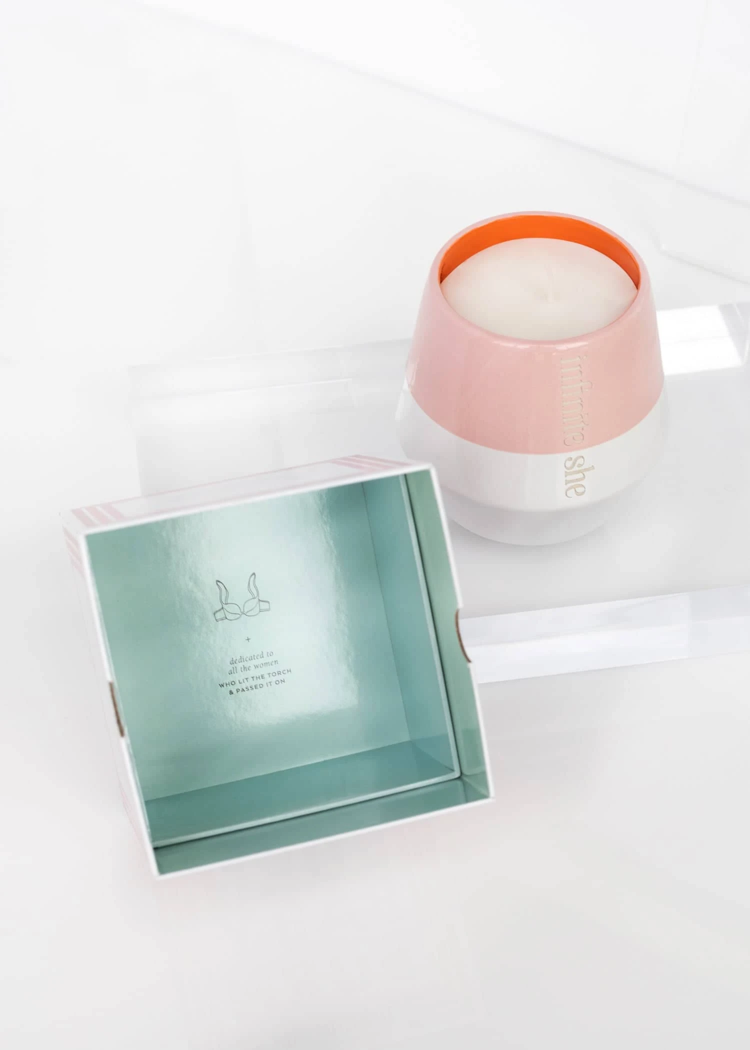 Inspired by mid-century design, our ceramic candles feature an engraved Infinite She logo, happy + bright orange interior, and are finished with a hand-dipped glaze. Each candle is placed in an ultra-chic, glossy box showcasing a freshly modern spin on seventies-style graphics. An inspiring quote + illustration on the interior of the lid make for a delightful surprise when the box is opened. A cheerful reminder to illuminate your inner radiance. - Fragrance NotesFresh Cut Iris, Black Vanilla Bean, Smudged Musk