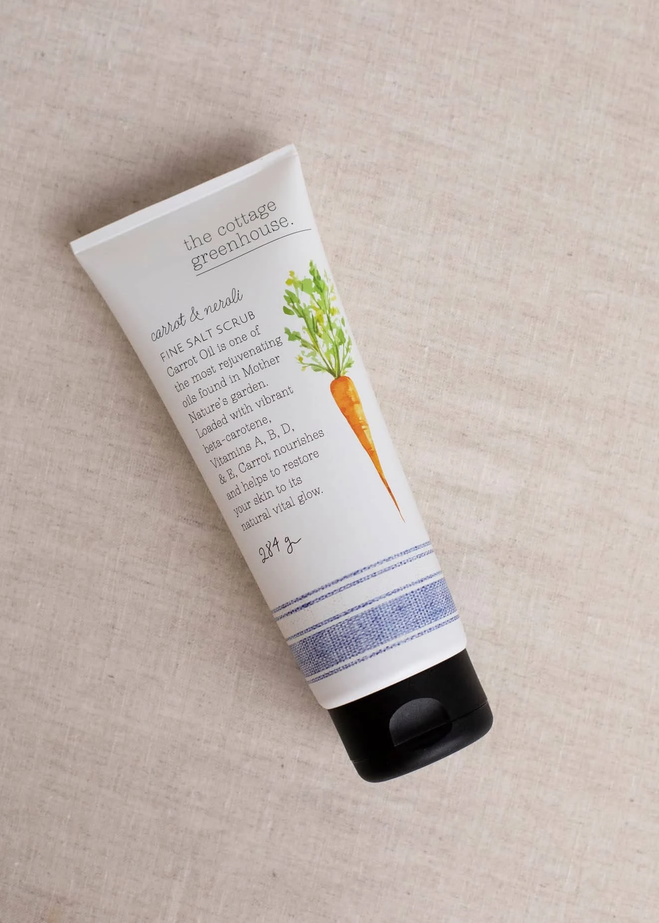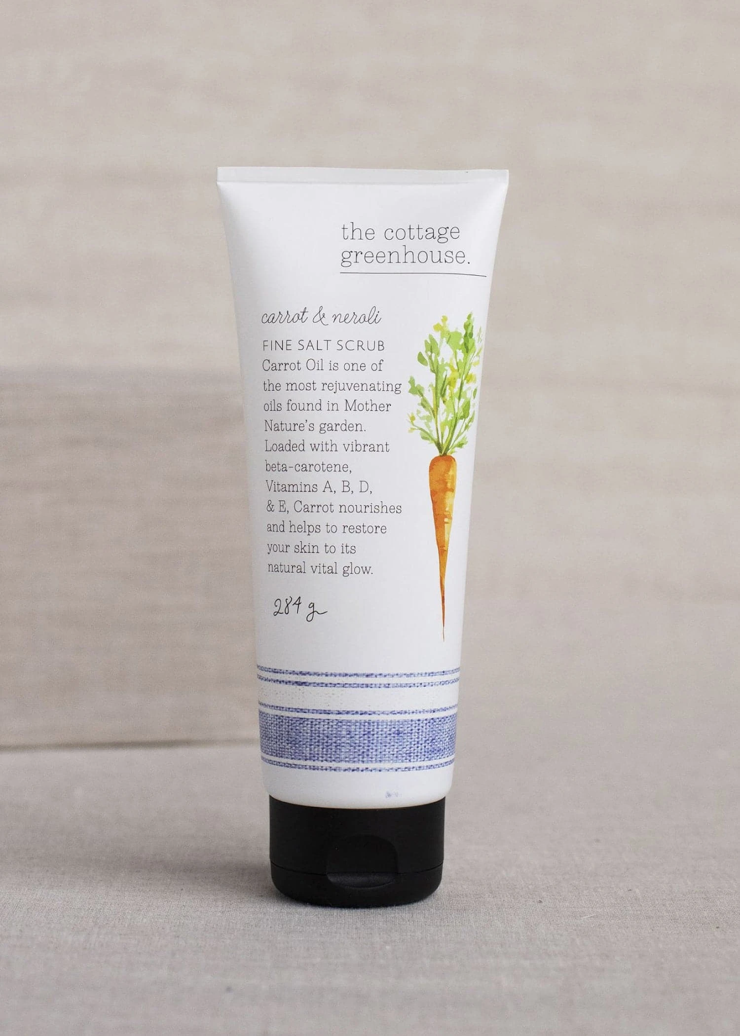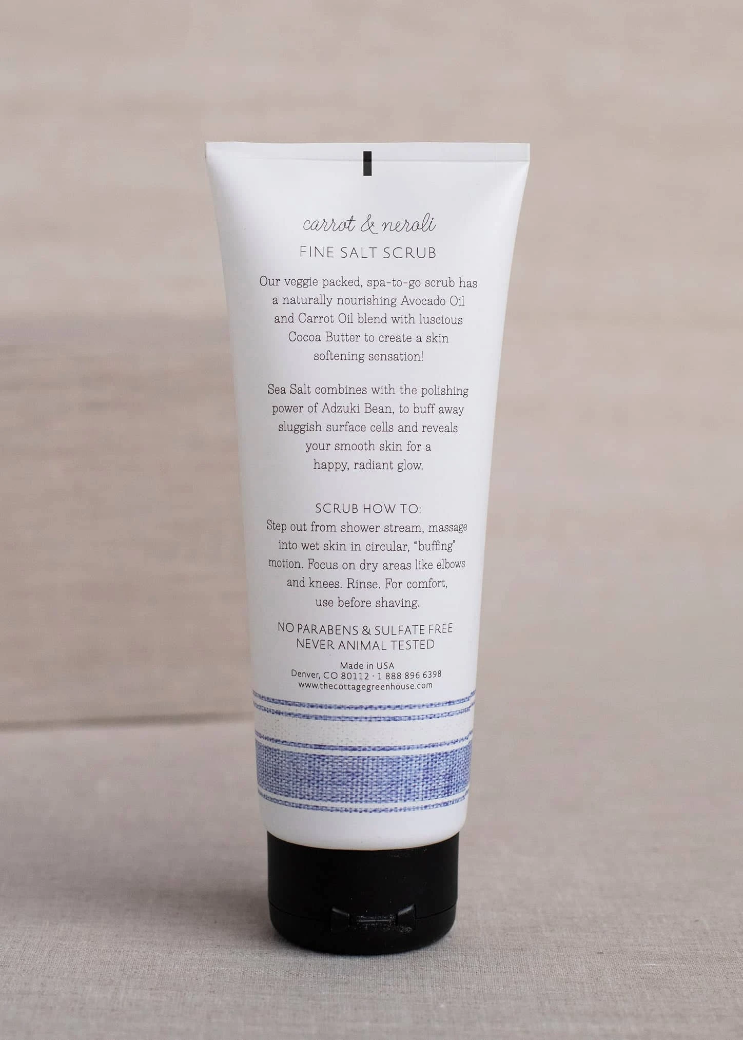 Our good-for-you, veggie packed, spa-to-go scrub! Naturally nourishing Avocado Oil and cheery Carrot Oil (known for its ability to visibly improve skin tone and improve general skin health) blend with luscious Cocoa Butter to create a skin softening sensation! Small granule Sea Salt combined with the polishing power of Adzuki Bean sloughs away sluggish surface cells to reveal your super smooth skin for a happy, radiant glow. - Fragrance NotesCarrot & Neroli