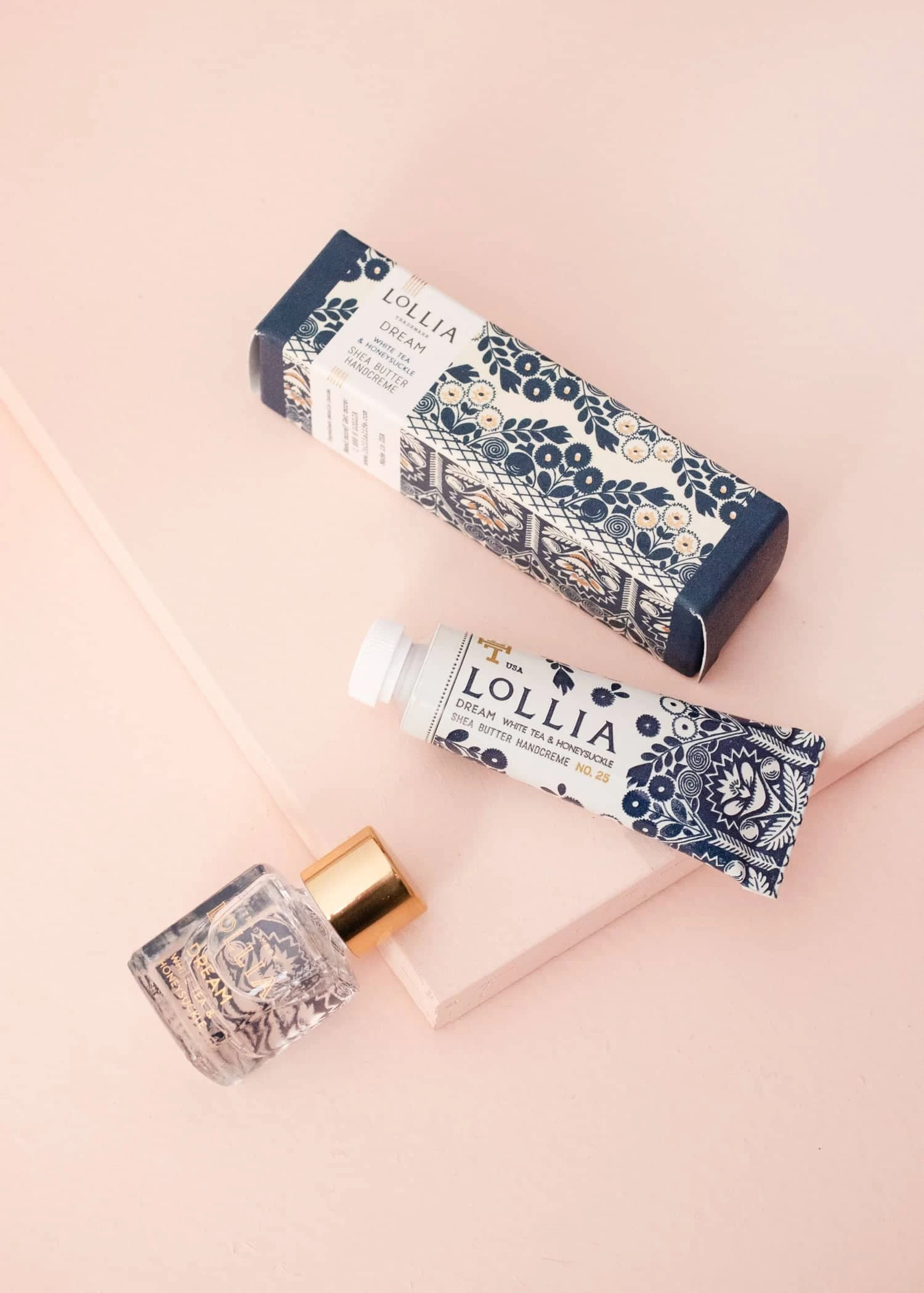 Soothe & smooth with this purse-size duo. A dreamy fragrance combination of Linden, White Tea, Bergamot and Honeysuckle is sweetly familiar, like a pleasant memory while drifting off to sleep. Paired with the rich hydration of Lollia’s signature Shea Butter Handcreme, it’s a luxurious treat you won’t want to leave behind. A breath of timeless beauty.