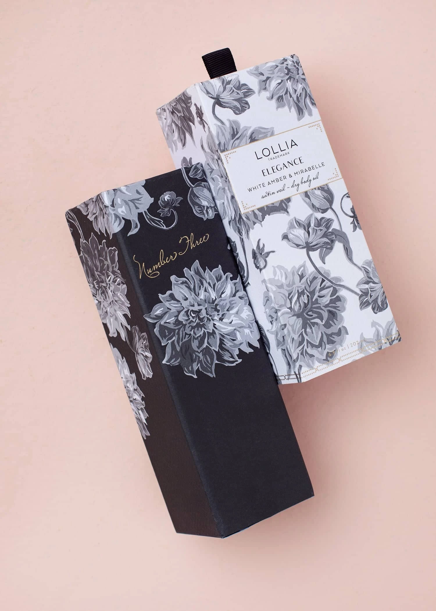 A gold kissed glass bottle nestles inside a gift-ready telescoping outer box adorned with a hand-laid floral pattern and dashing gold embellishments. Gently pull the ribbon tab at top to slide it open and reveal a golden-hued pump-top glass bottle that’s effortlessly chic.