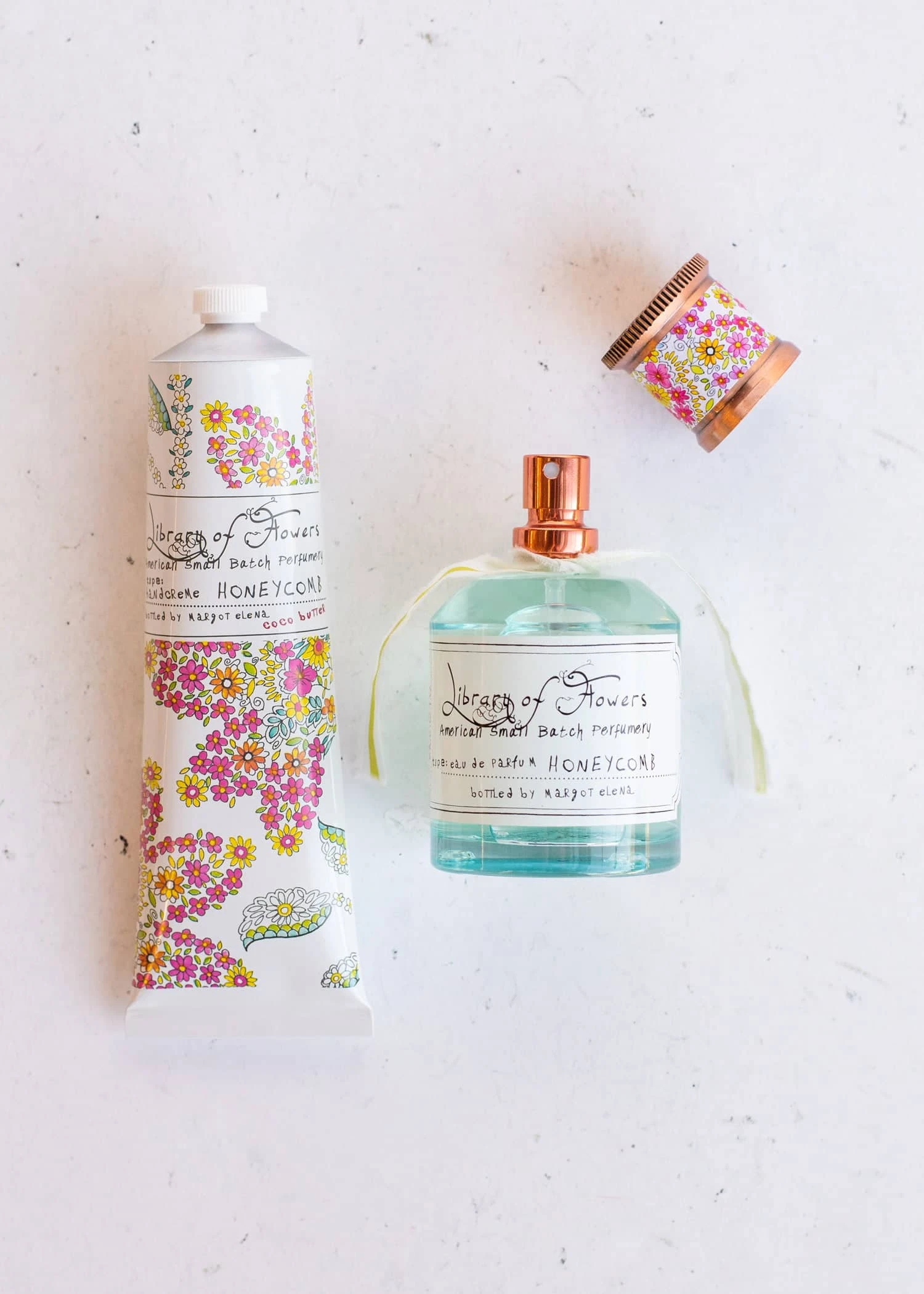 This Library of Flowers Honeycomb Duo tells a fragrant story through artfully crafted Eau de Parfum and lush Handcreme packed with rich Cocoa Butter & extra-conditioning Shea Butter. Leaves skin sublimely scented & irresistibly soft. A delightful pick me up for the senses.
