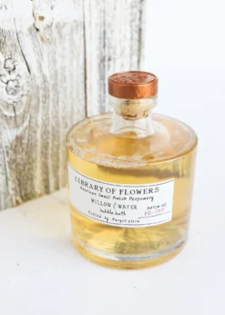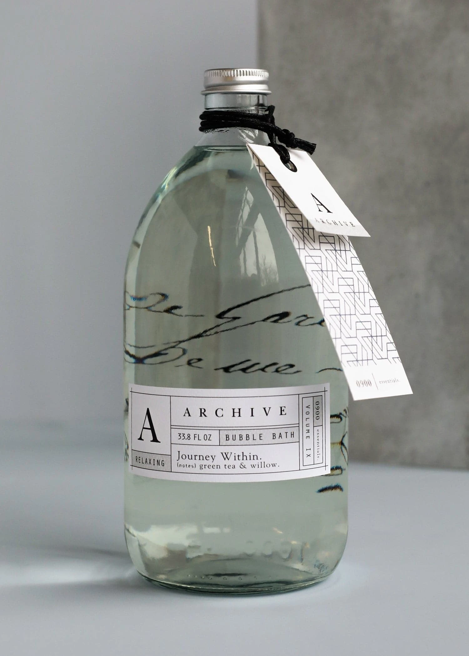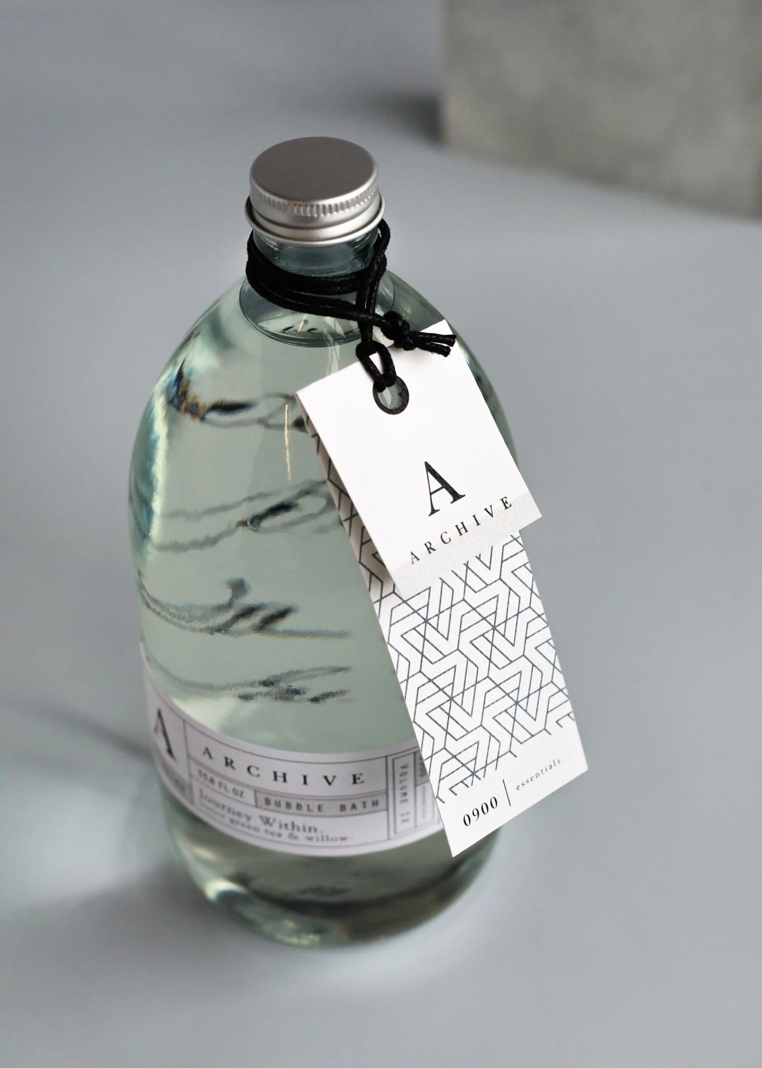 Gaze into this classic bottle for a glimpse into the past: its transparent glass reveals handwritten passages from antique books. Sophisticated and timeless, this keepsake piece—topped with a hand-tied waxed cord and an aluminum cap—makes a statement long after the last luxurious soak.