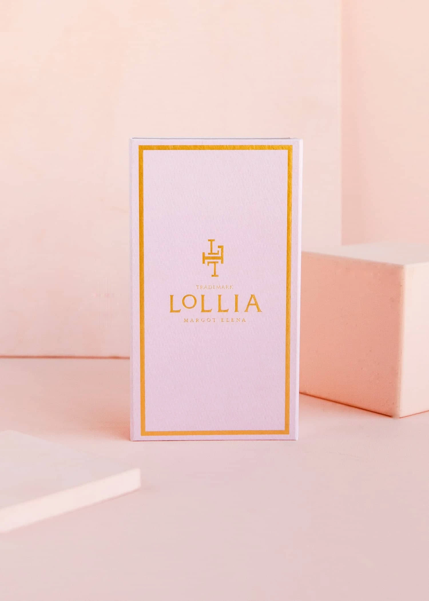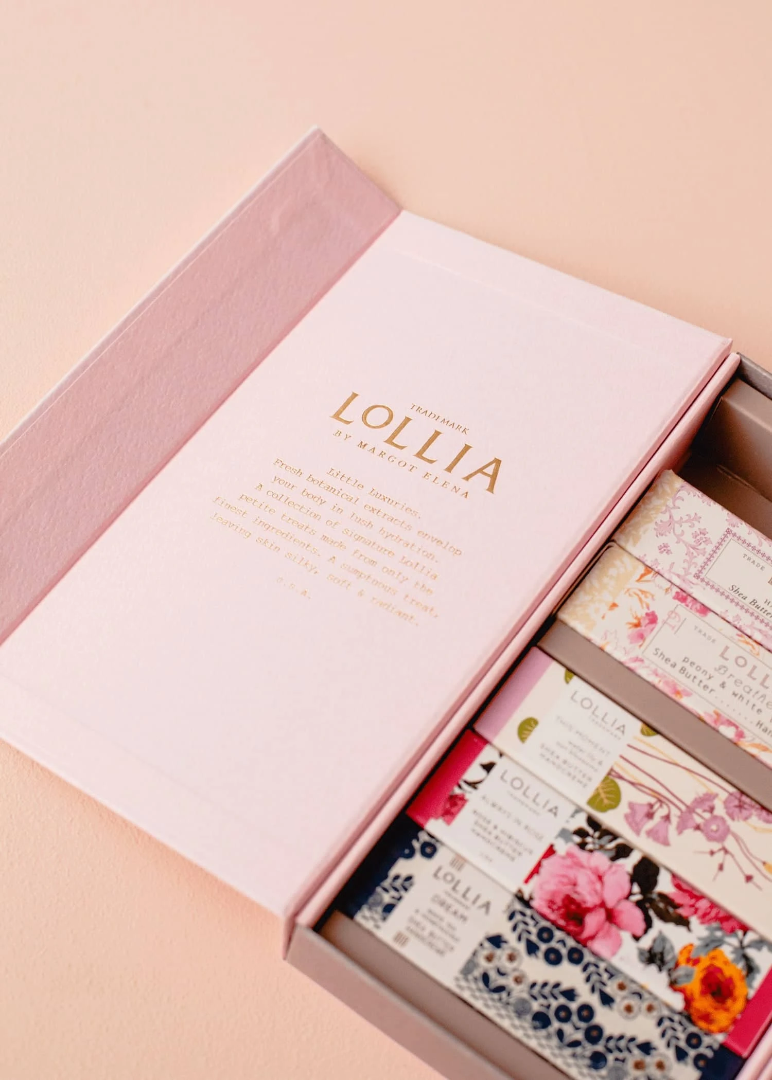 Nestled in a beautiful gold-kissed box, each miniature handcreme showcases an iconic Lollia pattern.